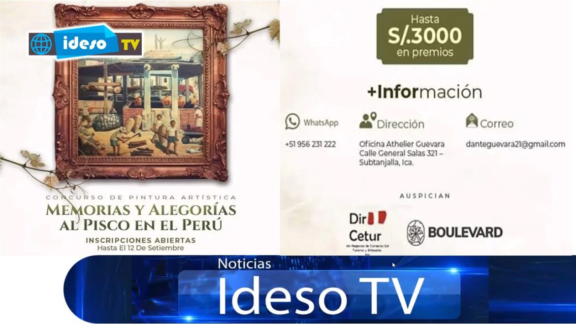 La Dirección Regional de Comercio Exterior y Turismo del Gobierno Regional de Ica, a cargo del Abg. Gustavo Huerta Escate, promoviendo la identidad, el arte y la cultura invita a todos los pintores de la Región Ica y del país a participar de este primer concurso en homenaje al pisco en el Perú, para tocar un lado de gran valor como es nuestro producto bandera desde sus orígenes a la actualidad.
