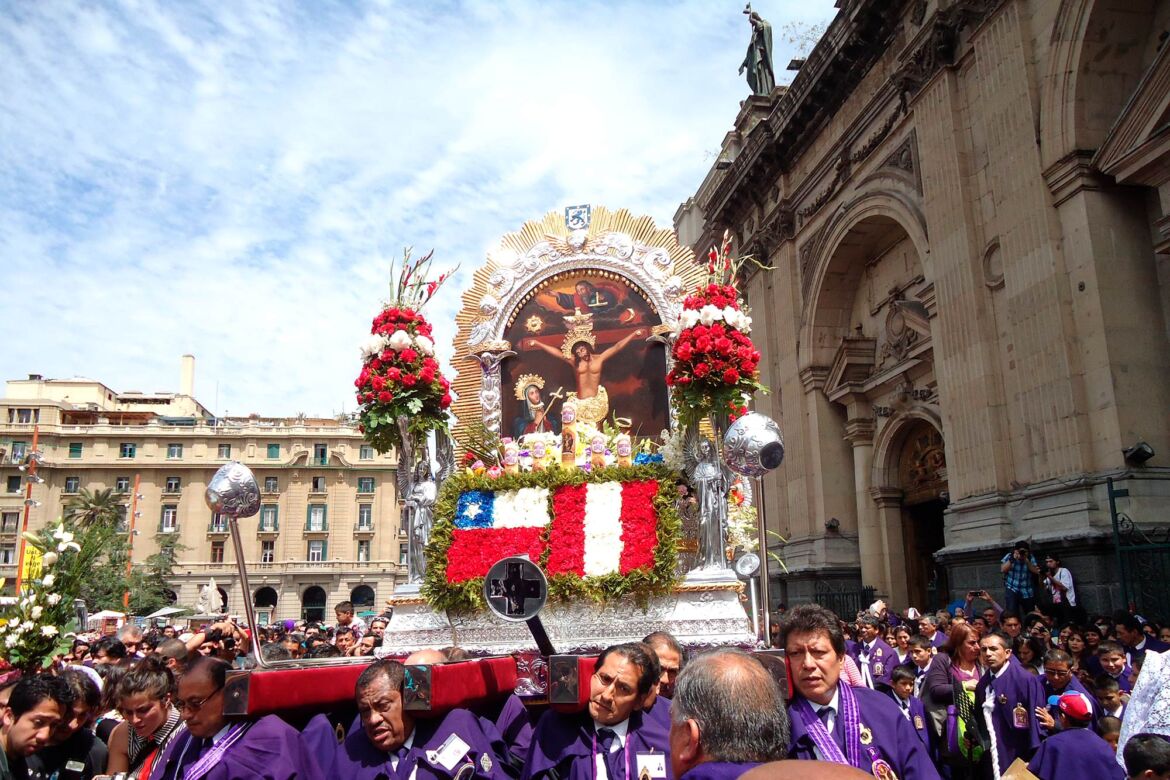 La Fiesta del Señor de los Milagros tiene sus raíces en la época colonial, cuando un esclavo angoleño pintó la imagen del Cristo Crucificado en una pared de adobe en el barrio de Pachacamilla en Lima. A pesar de los intentos por borrarla, la imagen del Cristo Moreno se mantuvo intacta, lo que fue interpretado como un milagro por los fieles. Desde entonces, cada mes de octubre se celebra la procesión en honor al Señor de los Milagros, con miles de personas vestidas de morado acompañando la imagen por las calles de la ciudad.